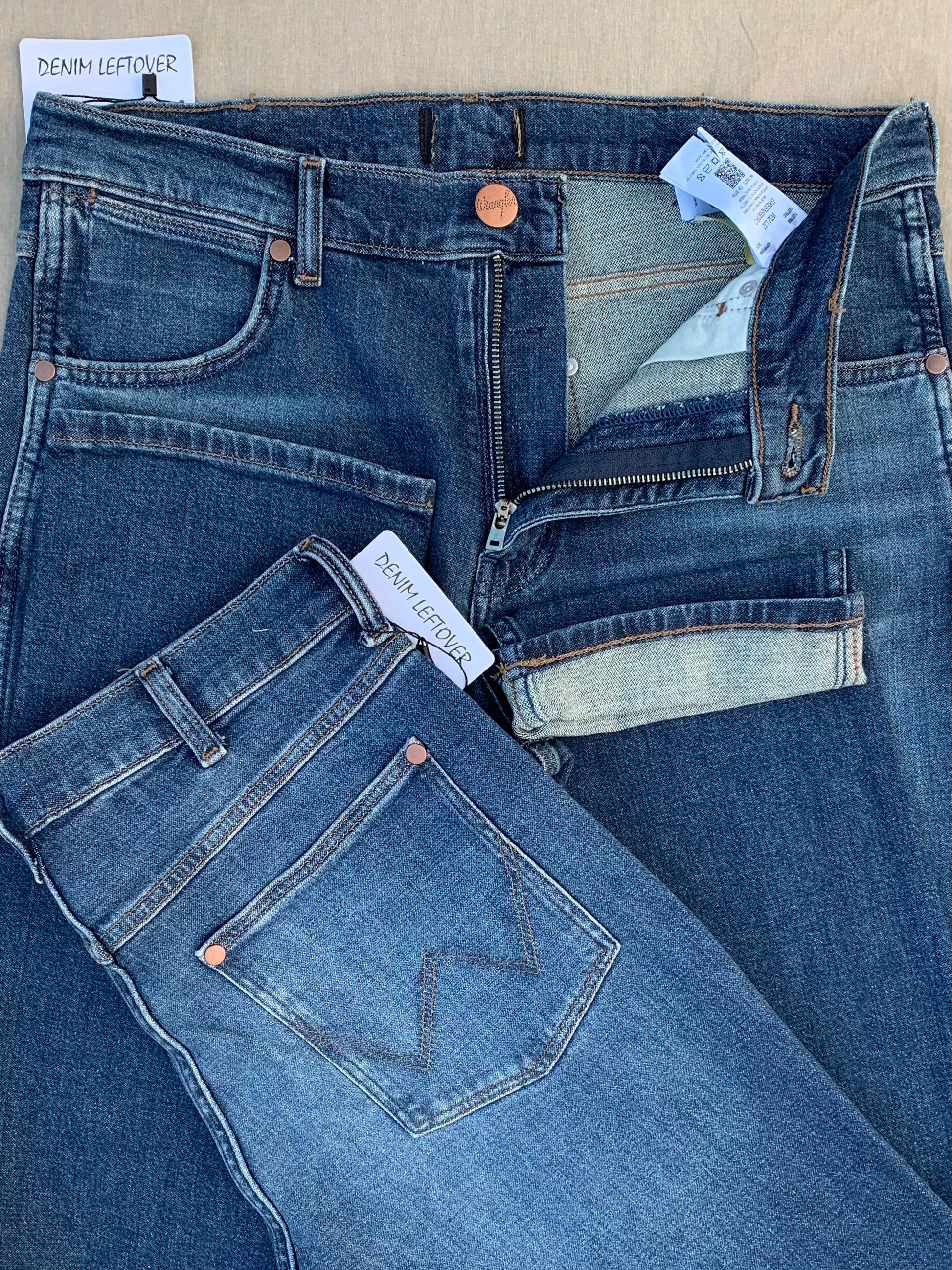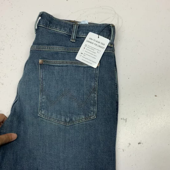 Original "WRANGLER" Denim Jean | Straight Fit | Medium Blue Wash | 12 oz Weight (Medium Weight Fabric) | Soft Hand-feel | 10% Stretch (Low Stretch) | Mid Rise | 5 Pockets | Zip Fly with button closure